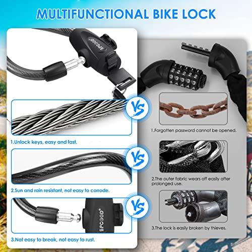 【ALTA SICUREZZA】La serratura della bici adotta il cavo d'acciaio di spessore 12mm, che ha una forte resistenza al taglio e alla corrosione. Il cilindro rinforzato della serratura della lega di zinco e la copertura durevole dell'alloggiamento dell'ABS rendono difficile per gli attaccanti aprire.