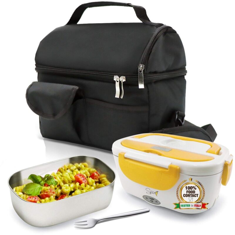 Set Borsa Termica + Scaldavivande elettrico Amarillo Inox. Borsa Termica: idaele per trasportate il pranzo di adulti e bambini, grazie alla tracolla regolabile e perfetta per il lavoro, la scuola, i pic-nic e per il tempo libero. Capacita 8 Litri. Dimensioni 25 x 16 cm x 22,5 cm di altezza. Rivestimento Termico interno imbottito per mantenere fresco e caldo fino a 8 ore. Cerniera Zip long life. Doppio scomparto, inferiore da 5 litri e scomparto superiore da 3 litri portafrutta o bevande fino a due bottigliette. Grande capacita oltre 8 litri. Dotata di multi-tasche 2 frontali e tre posteriori. Pensata e studiata per conternere perfettamente lo Spice Scaldavivande Amarillo Inox. Scaldavivande: al lavoro, a scuola, in vacanza, dovunque tu abbia voglia di consumare caldo il tuo pasto, in completa autonomia e comodità. Amarillo Inox si differenzia dagli altri scaldavivande grazie alla sua pratica vaschetta estraibile in acciaio inossidabile da 1,5 litri permette una perfetta igienizzazione
