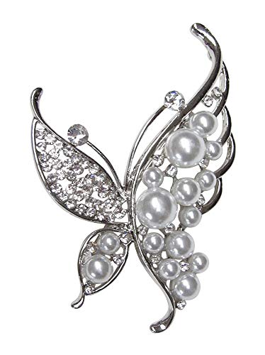 Spilla in acciaio argentato a forma di farfalla e perle perlate.