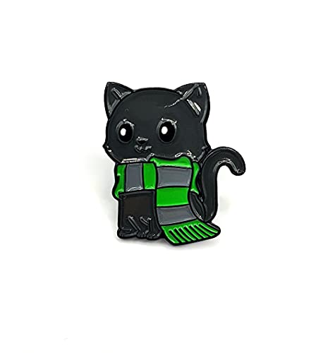 Spilla in metallo smaltato con gatto nero e sciarpa verde mago scuola
