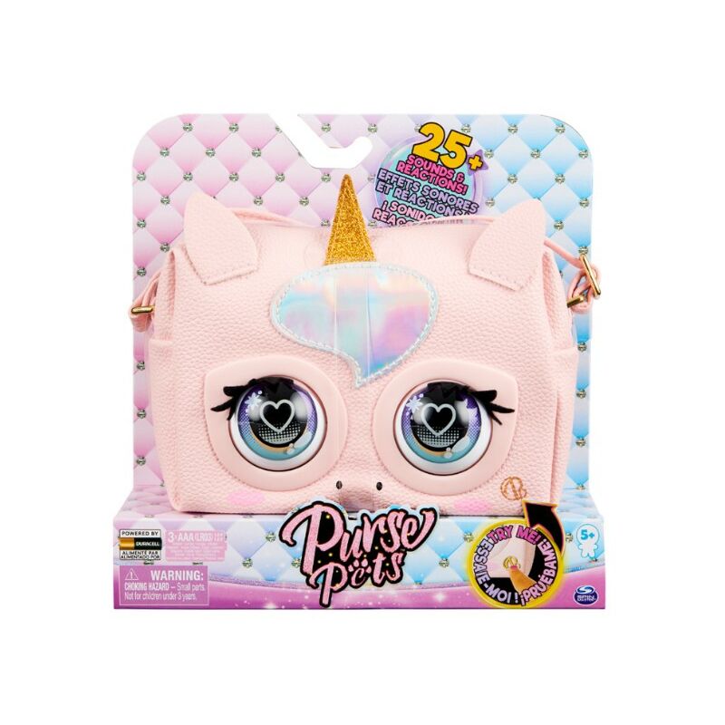 Spin Master Purse Pet Borsetta Unicorno . Borsetta interattiva super fashion con oltre 25 suoni e reazioni. Dai vita al tuo look con Purse Pets! Purse Pet Borsetta Unicorno è in ecopelle verniciata iridescente di colore rosa con un corno glitterato e cinturino regolabile. I suoi occhi, ispirati alla pop art, lampeggiano davvero! Mentre sei in movimento, lei sbatte le palpebre e interagisce con te. Accarezzala e tienile la fronte per farle sbattere le palpebre e mandare un bacio! Purse Pet emette suoni carini e sfacciati, fa le fusa, manda baci, suona la musica della sfilata di moda e molto altro! Ideale da 5 anni