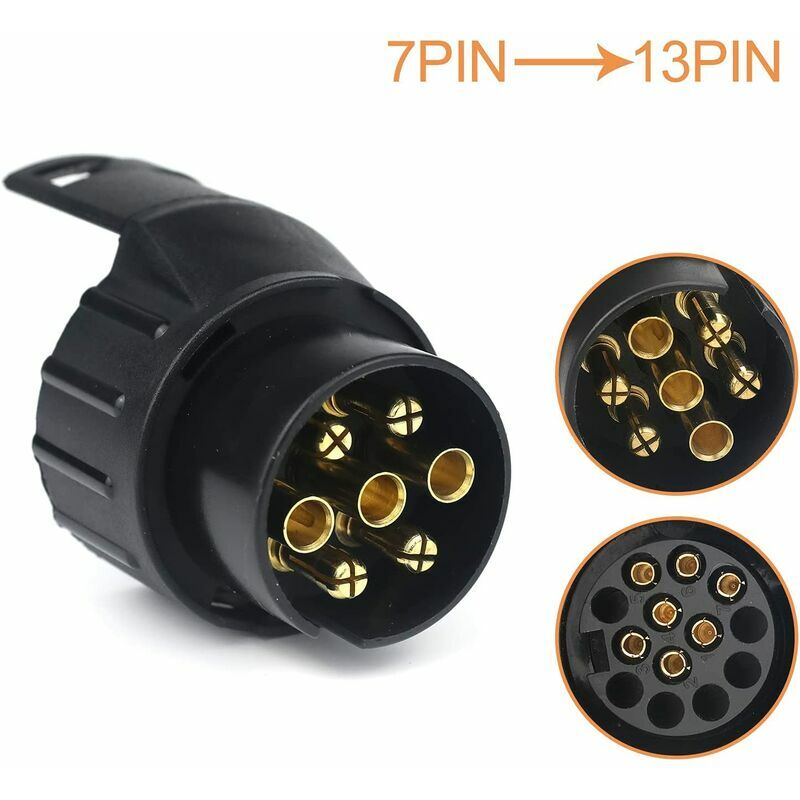 Standard europei: adatto per la maggior parte delle auto e dei rimorchi, adattatore per rimorchio da 7 pin a 13 pin. Trasferimento del segnale: stabilisce il collegamento stabile e sicuro tra un veicolo principale e un veicolo trainato e trasmette la lampada elettrica segnale al rimorchio. Impermeabile: l'alloggiamento in plastica previene la ruggine e migliora l'aspetto. Impermeabile per un uso sicuro. Durevole e robusto: realizzato in nylon e rame, materiale di buona qualità, solido e resistente. Tensione di utilizzo: 12V Dimensioni del prodotto: 82x52x48mm Peso del prodotto: 71,6 g Funzione del prodotto: utilizzato per convertire la spina a 7 pin in una spina a 13 pin Colore: nero Quantità consegnata: 1 pezzo