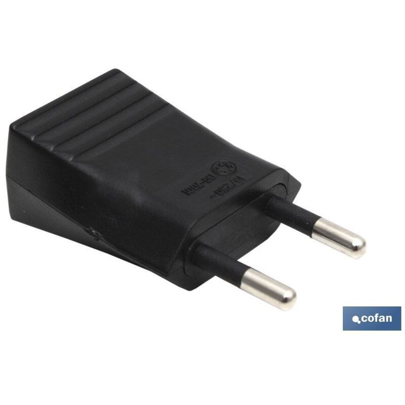 Spina bipolare da 10 A Classe II, con spinotti Ø 4 mm senza collegamento a terra. 250 V~. Colore nero. Materiale di fabbricazione termoplastico. Caratteristiche tecniche