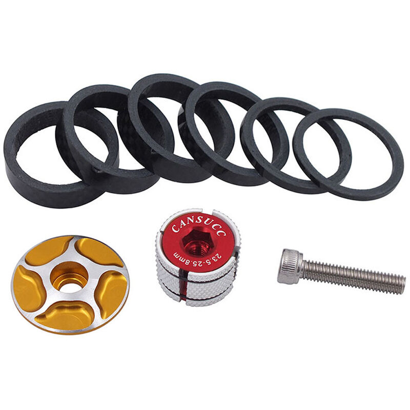 Specifiche: Colore tappo superiore: nero/rosso/blu/oro (opzionale) Materiale: fibra di carbonio + lega di alluminio + acciaio inossidabile< br /> Spessore distanziatore: 8 mm, 5 mm, 3 mm, 2 mm Peso articolo: 46,5 g/ 1,6 once Dimensioni confezione: 150 * 50 * 50 mm/ 5,9 * 2,0 * 2,0 pollici Peso del pacchetto: 50 g/ 1,8 once Lista di imballaggio: 6 * Distanziatore per cuffia 1 * Bullone a vite 1 * Nucleo sospeso di espansione 1 * Tappo superiore dello stelo