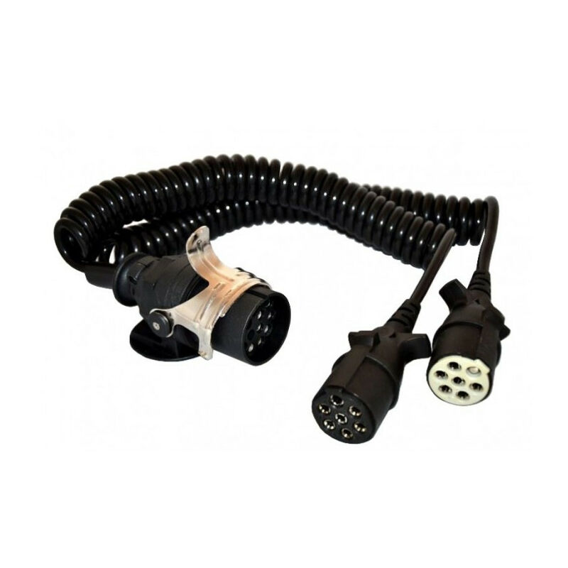 Materiale TPU Spine senza manicotto in gomma/plastica, spina in plastica completa Sezione cavo 12×1,5 + 3×2,5 mm² Diametro cavo Ø 13,5 mm Diametro spira Ø 40 mm Lunghezza max. estensibile 3,5 m Norma ISO 12098 Confez. 1 pz. Rispetta tutte le normative Europee, dal design compatto e con connettori ISO. Manicotto antipiegatura con guaina esterna nera con protezione blu. Realizzate con poliuretano per resistere al calore e alla luce. Adattatore 15 a 7 poli per motrice e rimorchi. 15 - 2x7 pin/24V