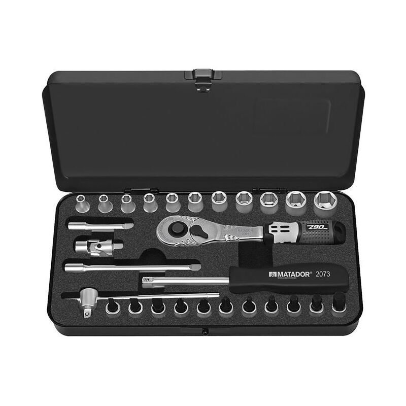 Chiave STC Impostato in 6,3 mm (1/4) Il classico robusto nella scatola in acciaio in lamiera stabile. SET CHIAVE STC, 6-TOKED, 6,3 mm (1/4), 28 PC. Nella scatola di lamiera in acciaio stabile, qualità permanente, polvere nera -rivestita. Con inserto in schiuma morbida MFS nero, resistente a oli e grassi, non più tintinnio. In dimensioni metriche e personalizzate. Contenuto: interruttore di leva. Estensione 50, 100 mm. Grip con la diapositiva. Articolazione universale. Impugnatura spina. Con inserti del cacciavite in: 4, 5,5, 7x32 mm, ph1, ph2, ph3x32 mm, esagono: 3, 4, 5, 6, 8x32 mm. Inserti chiave STC in: 4, 4,5, 5, 5,5, 6, 7, 8, 9, 10, 11, 13 mm. Realizzato in acciaio cromatico vanadio. Tutti gli inserti a chiave socket con rivestimento super cromato per una finitura superficiale più fine e una forte resistenza a danni, graffi ecc. Con profilo SmartDrive che protegge le teste a vite e dado, poiché la forza viene trasferita ai fianchi e non agli angoli. Matador è uno dei pionieri del