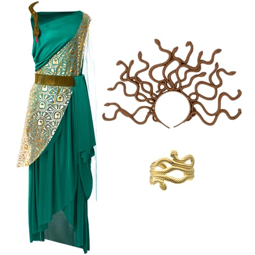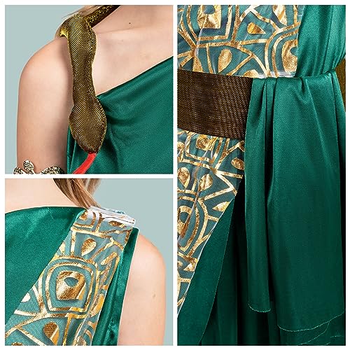 Confezione super conveniente: Questo set di costumi da Medusa verde comprende 1 abito, 1 fascia, 1 bracciale, 1 cintura, 1 nastro e 1 fascia. Trasformatevi nella mitica creatura con il nostro set completo di costumi, perfetto per scatenare la Medusa che è in voi.
