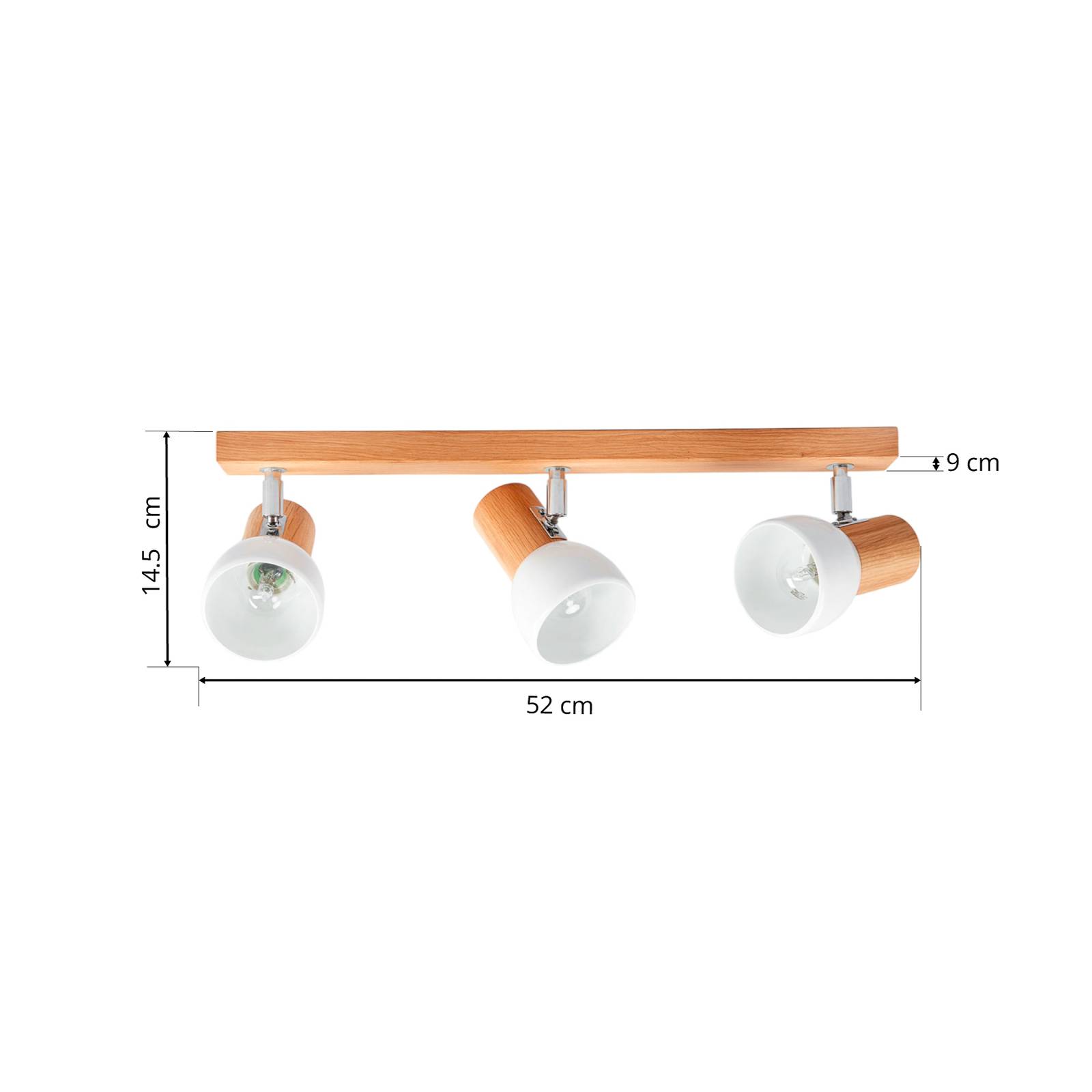 Svenda - plafoniera di bella forma dal carattere naturale La plafoniera Svenda è formata da una trave in legno lunga 52 cm e tre faretti orientabili. I portalampade sono in rovere, mentre i paralumi sono realizzati in metallo bianco. La luce delle lampadine con attacco E27 passa solo attraverso le aperture tonde dei paralumi e crea un'illuminazione ottimale, su misura per l'ambiente. La lampadina idonea è indicata nella lista degli accessori.