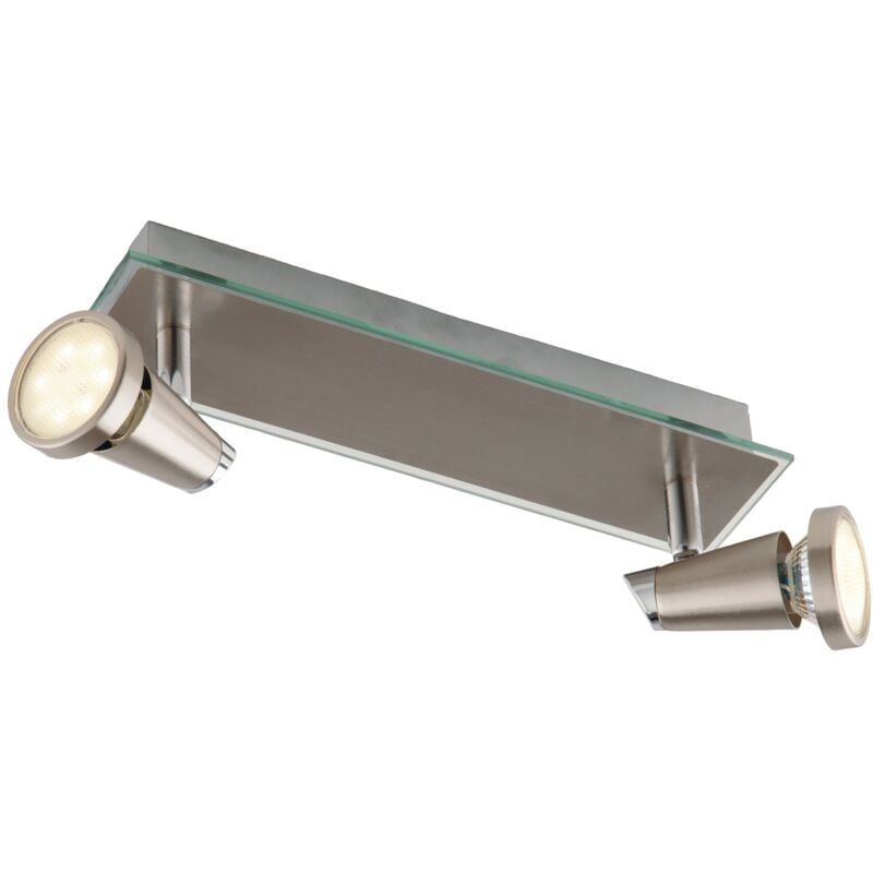 Spot in metallo con punti luce orientabili con finitura in nickel spazzolato e base con cornice in vetro trasparente. Colore: Nichel Materiale: Metallo e vetro Tipo sorgente o lampadina richiesta: GU10 Watt: 5W Lumen: 400 Lumen Kelvin: 2700K Grado di protezione da corpi solidi e acqua: IP20 (solo uso interno) Altre informazioni: ;