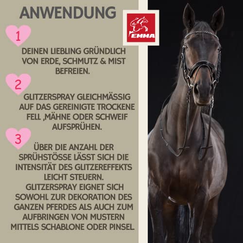 Cura del cavallo e del manto con glitter argento o oro I shine spray EMMA - spray per il manto, per la coda e per la criniera cavallo un cavallo sempre pulito e brillante => lucentezza e pelo senza nodi I spray disfeltrante: Anche con un manto opaco, le croste secche sono facili da rimuovere I Pettinatura e toelettatura più facili con la spazzola per cavalli e lo spray nel cambio del manto, quindi spazzolare via la polvere e lo sporco con lo spray per la lucentezza del manto EMMA