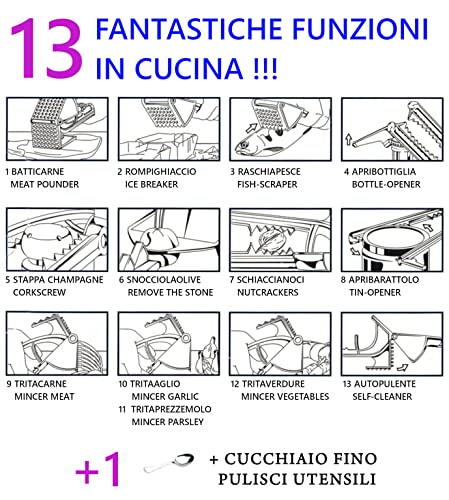 Spremiaglio batticarne raschia pesce apribottiglie snocciola olive schiaccianoci apri barattolo tritacarne trita verdure con cucchiaio 14 funzioni prodotti italiani CREAZIONI i Colori nel Cuore