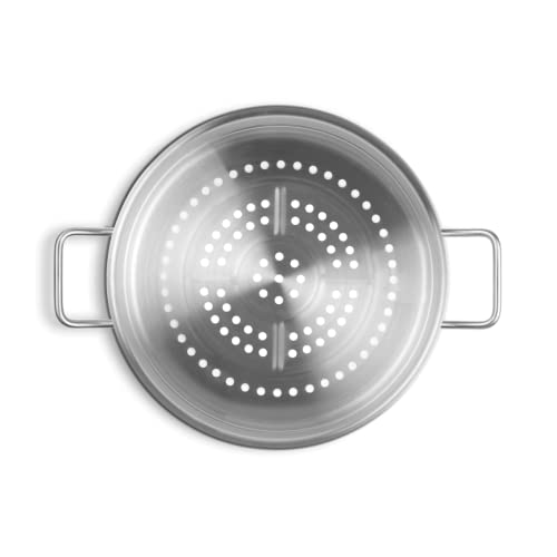 PRATICO ACCESSORIO - In aggiunta alla pentola, la fornitura comprende anche 2 inserti adatti: un inserto per la cottura a vapore per pietanze ricche di nutrienti e un colapasta per togliere la pasta senza doverla scolare.