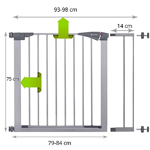 Parametri: griglia di protezione per scale con sistema di tensione, colore grigio, larghezza totale con prolunga: 93 - 98 cm, griglia di bloccaggio con doppia sicurezza