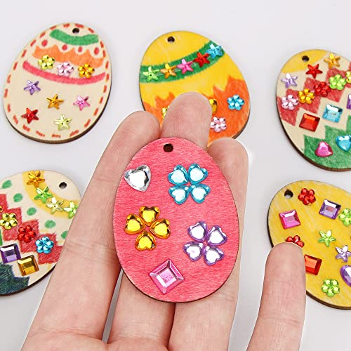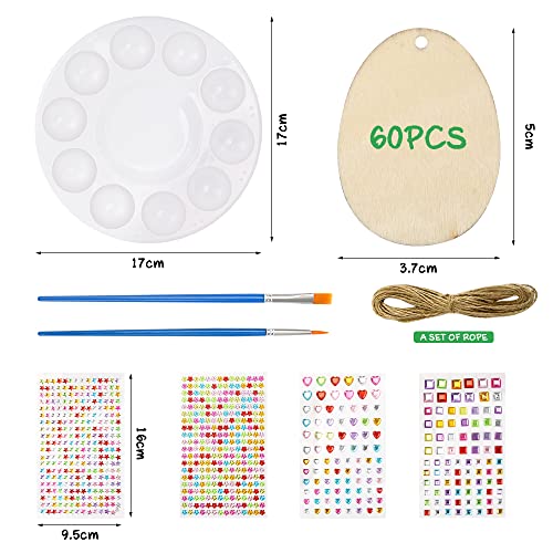 【60 Pezzi Kit artigianale pasquale】Include 60 uova di Pasqua in legno, 4 fogli di adesivi con strass, un rotolo di spago, una spazzola a testa piatta, una spazzola appuntita, un vassoio.