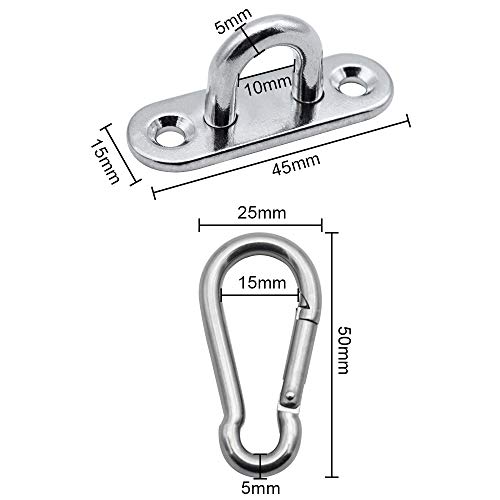 SPTwj 4 Pezzi M5 Piastra a Occhiello in 304 Acciaio Inox 4 Pezzi Moschettone a Molla Graffetta Hardware per Swing Amaca Aerial Yoga e Parasole Escursioni Viaggi Portachiavi con Viti