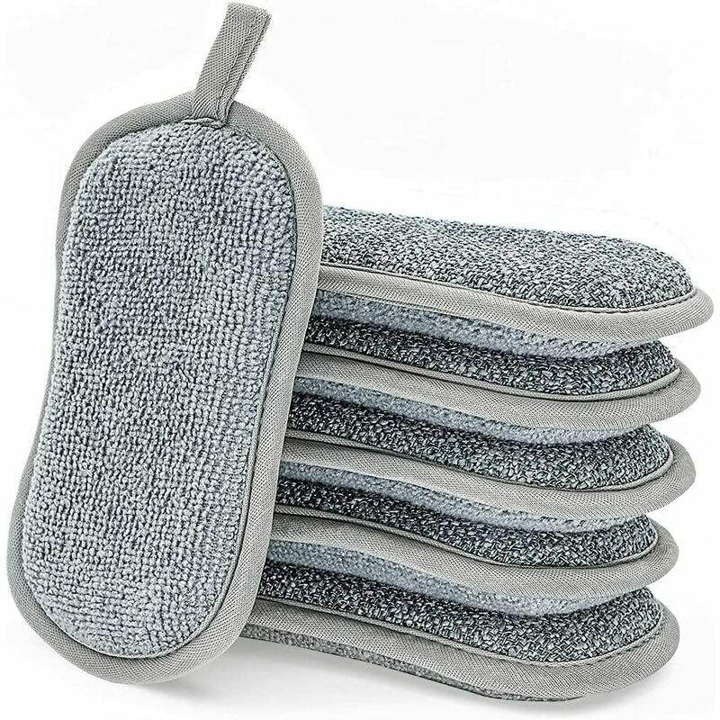 Pulizia senza sforzo: hai avuto problemi a pulire cibo sporco o bruciato sulle padelle? Con il nostro panno in microfibra/spugna progettato dal nostro marchio. La microfibra efficace 2 volte più forte rimuove sporco, grasso e il 99% dei batteri. SPUGNA LAVABILE E CANCELLABILE A DOPPIA AZIONE CON DURO LAVORO: Queste spugne sono state costruite per durare. Sono realizzati in poliestere, poliammide e poliuretano di altissima qualità, parte anteriore: spugna resistente, parte posteriore: microfibra di alta qualità, assicurando che non si usurino in una settimana come fanno i tamponi. Spugnetta acquistata in negozio. Il lato in spugna lavabile versatile e resistente è l'ideale per la pulizia, e il lato in microfibra di alta qualità è l'ideale per un lavaggio delicato, una pulizia efficace con la sola acqua per wc, lavelli, bagni, stoviglie, fornelli. SENZA SOSTANZE CHIMICHE E DI LUNGA DURATA: la spugna da cucina dura è priva di sostanze chimiche nocive. Per la salute e la sicurezza dei