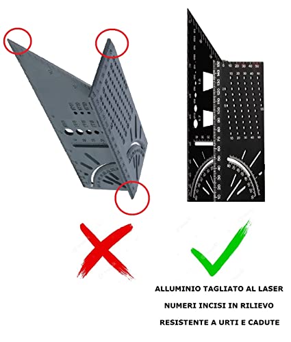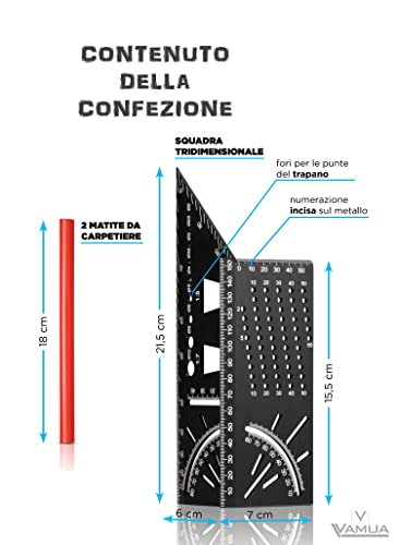 SQUADRA PER FALEGNAME - La squadra tridimensionale Vamua è uno strumento multiuso per misurazioni professionali per falegname e appassionati di fai da te. Il nostro set comprende una squadra 3D e due matite da carpentiere. Finalmente sul mercato un attrezzo resistente completamente in alluminio di eccellente qualità. Vamua, fai da te ma con noi