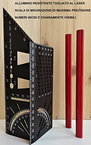 MOLTEPLICI MISURAZIONI- La squadra in alluminio Vamua è un attrezzo versatile e completo perché è adatto per tutte le misure multidimensionali, marcatura, tracciatura, stesura ecc. La squadretta è anche un righello multiangolo grazie alla sua angolazione obliqua. Le due matite sono in legno robusto e la loro mina nera scrive in modo chiaro e leggibile.