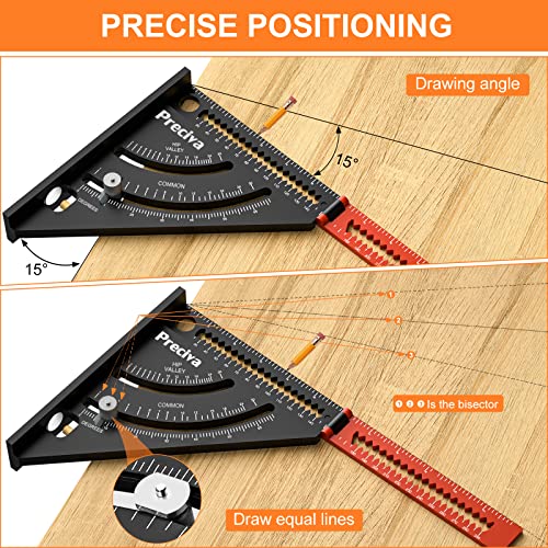 SPEED SQUARE AMPIAMENTE UTILIZZATO: Righello triangolare pieghevole multifunzionale per la lavorazione del legno, può disegnare un angolo da 45 a 90, una linea di equilibrio, una linea verticale e disegnare un punto centrale equidistante e un pulsante di posizionamento regolabile corrispondente a tutti i pun