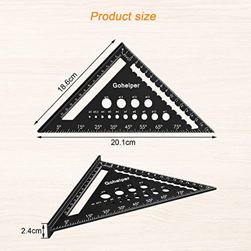 【Alta qualità】: Squadra da falegname è realizzato in alluminio spesso 4 mm, Squadra falegname è forte e resistente all'usura, non facile da rompere.Squadra falegname ha una buona durezza, resistenza alla corrosione e al ricamo. Misura triangolare elimina la necessità di più strumenti per misurare, le sagome di perforazione e i marcatori di fori profondi di squadra da falegname semplificano le misurazioni accurate.