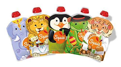 SQUIZ - AZIENDA FRANCESE - Confezione da 5 Contenitori Ricaricabili e Riutilizzabili 130ml Senza BPA - Per Frutta frullata, Purea e Smoothie - Per Neonati, Bambini e Adulti - Collezione CARNEVALE - PRODOTTO IN SVIZZERA