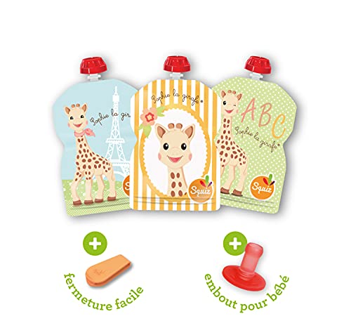 SQUIZ Borracce pieghevoli riutilizzabili, 3, motivo: Sofia la giraffa, 90 ml, 1 beccuccio bébé SQUIZ'TOP-fabbricazione svizzera