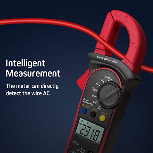 ST201 Multimetro Digitale Automatico, Pinza Amperometrica Tester di Resistenza Diodi Misuratore Corrente Tensione CA CC con Display LCD per la Misurazione Test Elettrici da Laboratorio e Case (Rosso)