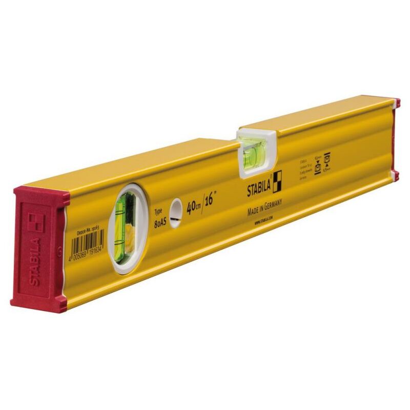Stabila Livella modello 80 ASM,120 cm Profilo sottile, stabile e maneggevole per ogni tipo di misurazione Descrizione Se siete alla ricerca di una livella precisa e affidabile con un profilo sottile, questo modello fra proprio per voi. Il profilo rettangolare in alluminio rinforzato del modello 80 AS e il procedimento di fissaggio della fiala STABILA garantiscono precisione e una lunga durata. Le fiale e la superficie di misurazione vengono allineate tra loro con precisione durante il processo produttivo e poi unite in permanenza. Così STABILA garantisce che la livella continuerà a misurare con precisione anche dopo molti anni. Questa livella mantiene ciò che promette. Vantaggi del prodotto Profilo rettangolare in alluminio con nervature di rinforzo grande stabilità e presa sicura durante il lavoro Stopper antiscivolo integrati per una presa sicura durante il tracciamento si evita così lo spostamento della livella. Il procedimento di fissaggio della fiala STABILA assicura una