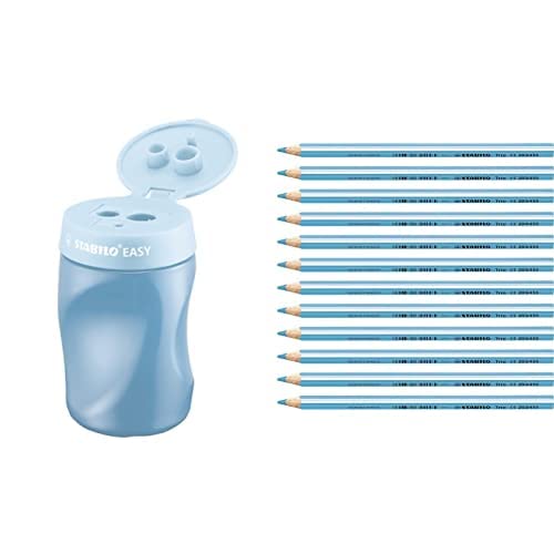 STABILO, Temperamatite Ergonomico - EASYtemperino per Destrimani - Azzurro + Matita colorata triangolare - STABILO Trio thick - Confezione da 12 - Blu Cielo