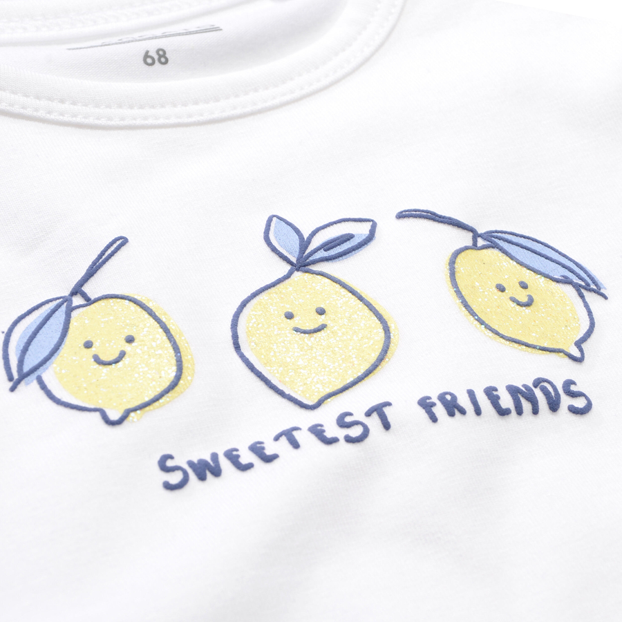 Dettagli prodotto: T-shirt con Print sul davanti Con volant sulle spalle Con bottoni a pressione sulla spalla Collo rotondo Combinazione versatile Materiale e cura: Materiale: 95 % cotone, 5 % elastan Lavabile a 30° C Non adatto all'asciugatrice Non lavare a secco Non candeggiare