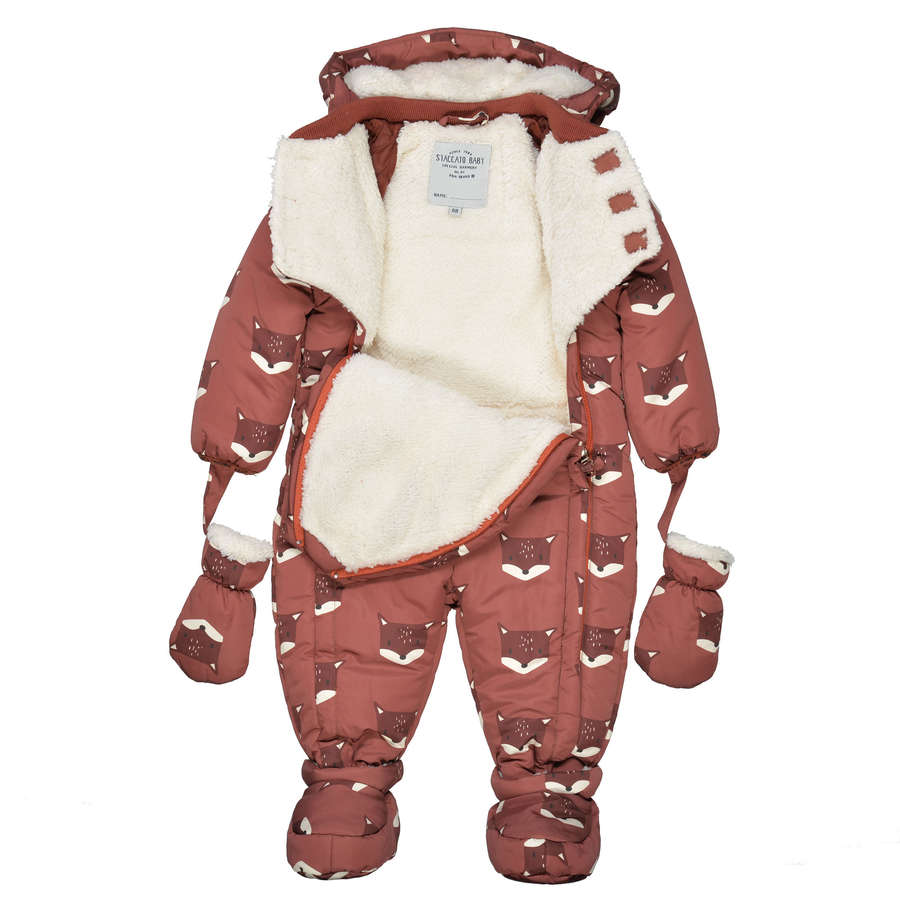 Dettagli del prodotto: Tuta da neve con volpe- Allover - Print Fodera interna in peluche Cappuccio staccabile e morbidamente foderato Si chiude con due cerniere sul davanti Guanti e scarpette rimovibili e morbidamente foderati Materiale e istruzioni per la cura: Tessuto esterno: 100 % poliestere Fodera: 100 % poliestere Lavabile a 30° C Non candeggiare Non lavare a secco