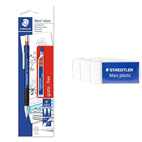 STAEDTLER Mars Micro Portaminas (Incluye Tubo de Minas 0.5 mm HB), Color Azul & Mars plastic 526 53 Gomma, 40 x 19 x 13 mm, Confezione da 3