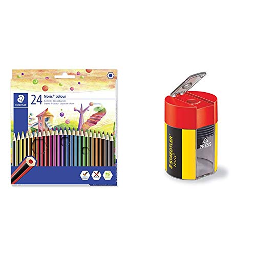 Staedtler Matite Colorate Noris Colour, Confezione Da 24 Colori Con Tonalita Differenti E Mine Resistenti In Wopex, 185 C24 & 511 004, Temperamatite Con Serbatoio