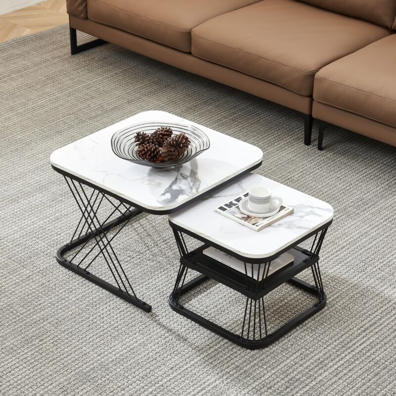 Funzioni Tavolo impilabile - Il tavolino ha un piano bianco con gambe in metallo nero. La combinazione di colori semplice e classica può completare perfettamente il tuo soggiorno. Materiale di alta qualità: il piano del tavolino è realizzato in ardesia robusta e durevole. L'ardesia è durevole, impermeabile e facile da pulire. Costruzione stabile - Il telaio è realizzato in acciaio verniciato a polvere. I pavimenti contengono una struttura aperta. La struttura quadrata in metallo fornisce un supporto stabile. Versatili: i tavolini non possono essere utilizzati solo insieme in soggiorno. Puoi anche usarli separatamente come tavolini o comodini. Installazione semplice Le chiare istruzioni di installazione sono incluse nella confezione e puoi completare facilmente l'installazione secondo le istruzioni. Specifiche Nome del prodotto: tavolini quadrati con gambe in metallo a forma di X Dimensioni complessive: Tavolo grande: 60x60x44,5 cm Tavolino piccolo: 45x45x39 cm Colore: bianco e nero