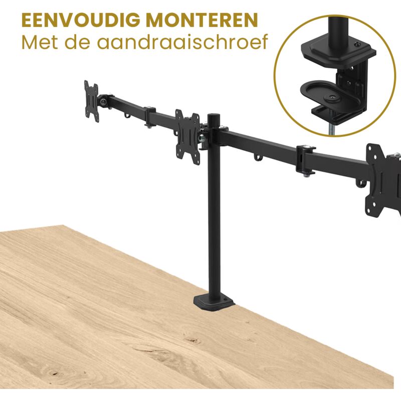 Trasforma la tua scrivania in un posto di lavoro piacevole ed ergonomico con staffa monitor Alora per 3 schermi. Monta tre schermi da 13-32 pollici contemporaneamente, con orientamento orizzontale o verticale. La staffa monitor è regolabile fino a 405 mm di altezza. Gli schermi collegati possono ruotare di 90 gradi, inclinarsi di 90 gradi e ruotare di 360 gradi. Questa staffa monitor sono adatti per VESA 75x75 e 100x100 e hanno una capacità di carico di 8 kg per braccio. La staffa monitor a parete sono facili da installare grazie ai due diversi metodi di installazione. I bracci del monitor vengono forniti anche con materiale di montaggio e serracavi. Gioca, lavora, programma o progetta come vuoi con questi bracci ergonomici per monitor di Alora! Cos'è VESA? VESA è l'abbreviazione di: Video Electronics Standards Association ed è uno standard a cui aderiscono la maggior parte dei produttori di televisori e consente di montare uno schermo piatto con una staffa a parete. Sul retro del