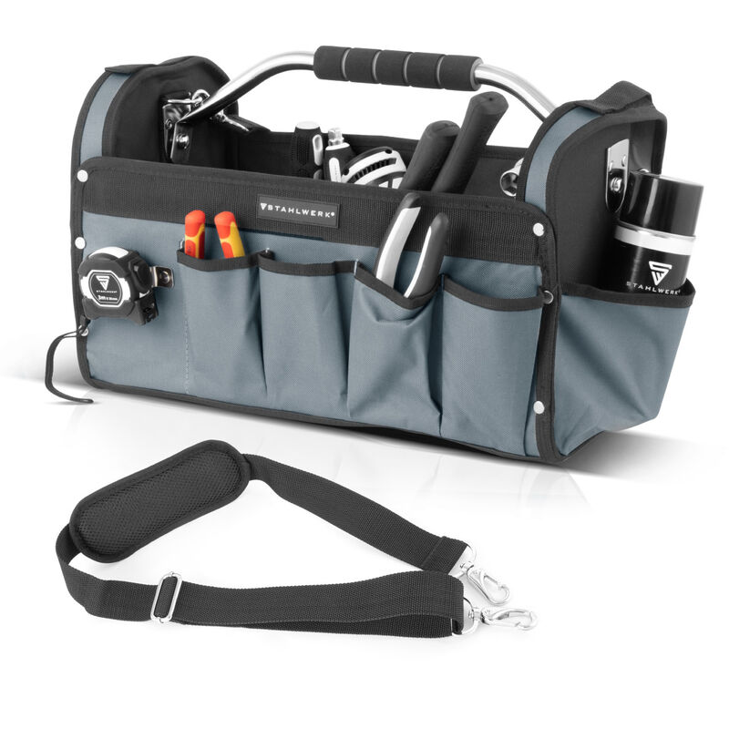 Borsa porta attrezzi STAHLWERK con 12 tasche esterne, 5 tasche interne e 7 passanti interni, robusta valigia / cassetta porta attrezzi / borsa di montaggio XL con maniglia di trasporto e tracolla in resistente tessuto di poliestere. Caratteristiche Robusta borsa portautensili XL in tessuto di poliestere resistente e durevole, con ampio spazio per gli attrezzi. 12 tasche esterne (di cui 1 con cerniera e passanti aggiuntivi), 5 tasche interne e 7 passanti interni offrono la massima flessibilità per riporre gli attrezzi. Maniglia di trasporto antiscivolo con sensazione piacevole al tatto e tracolla imbottita regolabile individualmente per un trasporto confortevole. La borsa portautensili professionale di alta qualità offre molto spazio e un rapido accesso agli utensili e alle piccole parti. Versatili supporti in velcro per il trasporto di oggetti più lunghi. I nastri di misurazione e gli altri strumenti possono essere facilmente agganciati a un pratico supporto per nastri e sono sempre a