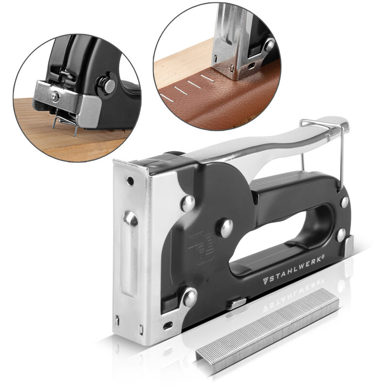 Cucitrice manuale STAHLWERK / cucitrice professionale / chiodatrice / imbastitrice 4-8 mm con 100 graffette tipo 53 per pinzare, spillare e imbastire carta, cartone, tessuto, pelle, pellicola e legno Caratteristiche La cucitrice manuale di alta qualità è ideale per pinzare, spillare e imbastire in modo professionale carta, cartone, tessuto, feltro, pelle, pellicola o legno. Una leva di pressione scorrevole con elevata forza d'impatto e un meccanismo di scatto a basso rinculo rendono la cucitrice facile da usare con poco sforzo. Realizzata in metallo privo di torsioni e con un alloggiamento verniciato a polvere, la cucitrice professionale è estremamente robusta, resistente e antiusura. La cucitrice è dotata di protezione anti-inceppamento, di un blocco di sicurezza aggiuntivo e di un pratico dispositivo di rimozione dei punti. L'impugnatura gommata con blocco della presa è di forma ergonomica e garantisce un lavoro senza fatica anche durante i cicli di lavoro più lunghi. La pinzatrice