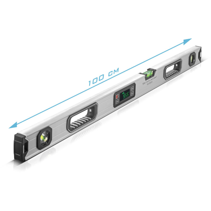 Caratteristiche Indispensabile in cantiere, per i lavori di ristrutturazione, in officina o in casa, la livella digitale STAHLWERK convince per l'estrema precisione delle misure. La livella, lunga 1000 mm, è dotata di una livella orizzontale e una verticale e i valori misurati possono essere comodamente letti su un chiaro display a LED illuminato. Un display a freccia a LED aiuta a livellare con precisione in orizzontale, verticale o diagonale (0° / 45° / 90°). È possibile aggiungere un segnale acustico come opzione. Una pratica funzione di mantenimento permette di mantenere e riprodurre l'angolo desiderato, mentre il pulsante di azzeramento consente di calibrare in loco in base alle esigenze individuali. I valori misurati possono essere visualizzati in gradi, per cento, mm/m e IN/FT. Per le misure dall'alto, il display ruota automaticamente di 180° per garantire sempre una leggibilità ottimale. L'inclinometro è dotato di una funzione di spegnimento automatico che spegne il