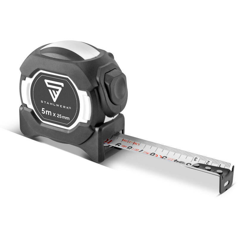 Il metro a nastro avvolgibile lungo 5 metri di STAHLWERK è ideale per misurare oggetti o pezzi e per misurare ambienti o distanze all'interno e all'esterno. Il metro a nastro avvolgibile in acciaio si adatta comodamente alla mano grazie alla forma ergonomica dell'alloggiamento gommato e resistente agli urti, realizzato in plastica ABS. Il metro a nastro largo e di facile lettura può essere facilmente estratto dalla custodia grazie alla linguetta di facile presa. Il metro a nastro avvolgibile è dotato di una retrazione controllata del nastro con funzione di arresto automatico. Un pulsante di riavvolgimento del nastro garantisce un rapido ritorno del nastro. La funzione di arresto consente di fissare rapidamente il metro alla lunghezza desiderata. La pratica clip da cintura e l'involucro gommato antiscivolo garantiscono un lavoro confortevole e un trasporto sicuro. Caratteristiche Molto adatto per misurare con precisione distanze fino a un massimo di 5 metri in ambienti interni ed