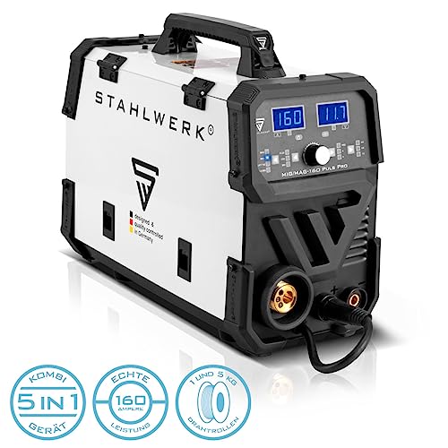 STAHLWERK MIG MAG 160 Puls Pro IGBT Saldatore ad arco metallico schermato Unità combinata full-synergic 5 in 1 con 160 Amp reali/flux cored, MIG MAG, ARC MMA, Lift TIG per saldatura alluminio