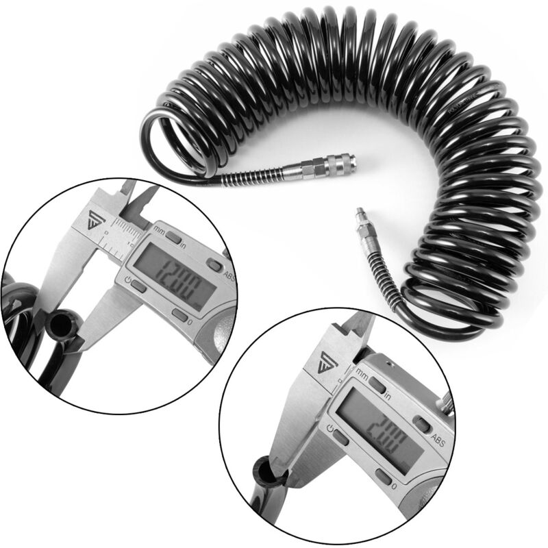 STAHLWERK DS-10 ST Tubo professionale a spirale per aria compressa in PU da 10 metri con attacco rapido e raccordo spinato. Il robusto tubo flessibile per aria compressa STAHLWERK DS-10 ST in PU è l'accessorio ottimale per i compressori per azionare tutti i tipi di utensili ad aria compressa. Il tubo ha uno spessore di parete di 2 mm e soddisfa i più elevati requisiti di qualità e durata. Il tubo a spirale per aria compressa ha un attacco rapido per collegare tutti i tipi di utensili ad aria compressa ed è dotato di raccordi in ottone nichelato su entrambi i lati e di una molla antipiega su ciascun lato. Le molle antipiega servono come stabilizzazione e scarico della tensione. Il tubo a spirale convince per l'elevata resistenza alla trazione e alla lacerazione ed è inoltre indeformabile e resistente alla pressione. Caratteristiche Raccordi di alta qualità con molle antipiega. L'attacco rapido e il nipplo a innesto sono preassemblati e garantiscono direttamente un lavoro pulito e