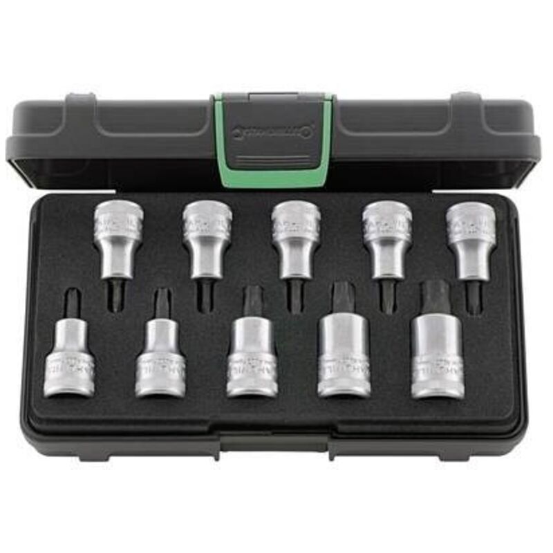 bussole secondo DIN 3124. Quadri interni / esterni secondo DIN 3120. Uso: Per viti con poligono interno Torx® con filettatura M4 − M14. Materiale: acciaio al cromo, cromato. Fornitura: Bussole per Torx® maschio: 10 pz. n. art. 643650 Dim. TX20;