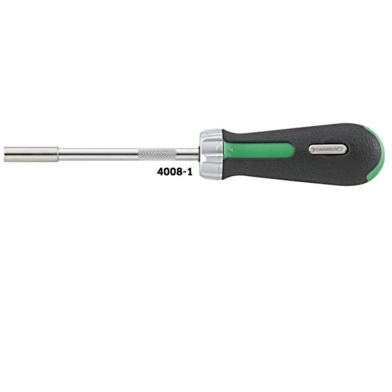 Birtift ï Easy Direction Change (a sinistra. Destra e fisso) con una breve rotazione dell'anello di commutazione.ï sagomato ergonomicamente. Maniglia a 2 componenti antiscivolo per la trasmissione ottimale della potenza. Vanuto di stoccaggio nell'estremità dell'impugnatura per 6 bit Si apre sulla semplice pressione di un pulsante (dimensione 1). Per i bit Inserti per cacciavite con presa outsidal Socket 1/4 DIN 3126 / ISO 1173 Form C 6.3.ï Gli inserti a prese 1/4 possono essere collegati alla parte di collegamento n. 3115/1 ( Socket esterna e quad-esterno 1/4) Utilizzato. Easy Bit Cambio tramite presa esagono con magnete.ï Zona ad alto carico zigrinata per contro-rotazione rapida delle viti, meccanismo ad alto carico con 48 denti (angolo di lavoro di 7,5 °).