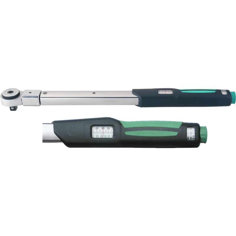 Chiave dinamometrica stabile, compatta, ad asta unica, preimpostabile secondo scala e rilascio automatico. Questa precisione rimane invariata per migliaia di serraggi, dato che tutti i particolari soggetti a usura sono in materiale di grande qualità e che l'asta flessibile viene sollecitata solo per brevi momenti. Corpo e impugnatura: tubo a sezione quadra stabile. Scale regolabili. Per serraggio antiorario grazie alle apposite teste intercambiabili per chiavi dinamometriche. Con cricchetto a innesto reversibile. Unità di misura: Nm, lbfft. Vantaggi: * Impugnatura ergonomica in bicomponente, resistente a liquidi aggressivi come combustibili, olio Skydrol, ecc. * Scala graduata protetta da una finestrella contro lo sporco ed eventuali danneggiamenti. * Regolazione rapida, precisa e sicura: estrarre e “ruotare” la manopola di regolazione per impostare il valore desiderato e “premere” la manopola per bloccare il valore. In assenza di forza elastica, la manopola di regolazione gira con