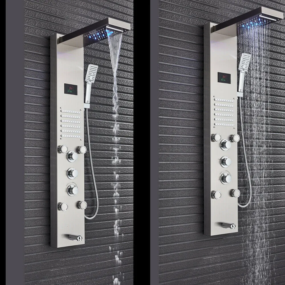 Stainless Steel Shower Panel Tower System LED Rainfall Waterfall Showerhead Multi-functional Nozzles Hydroelectricity Display