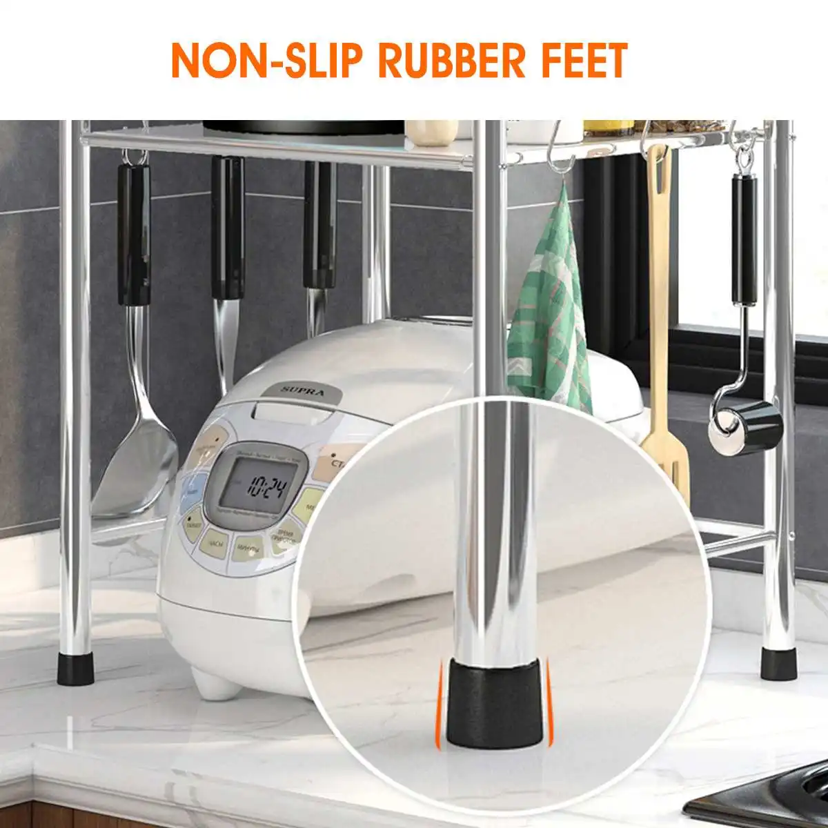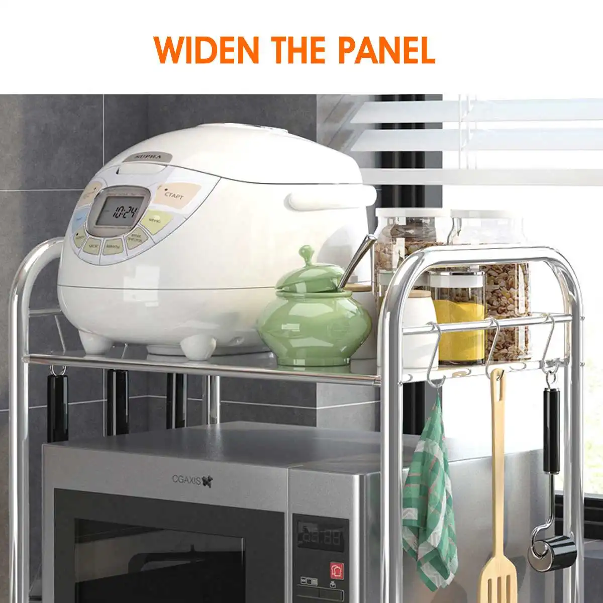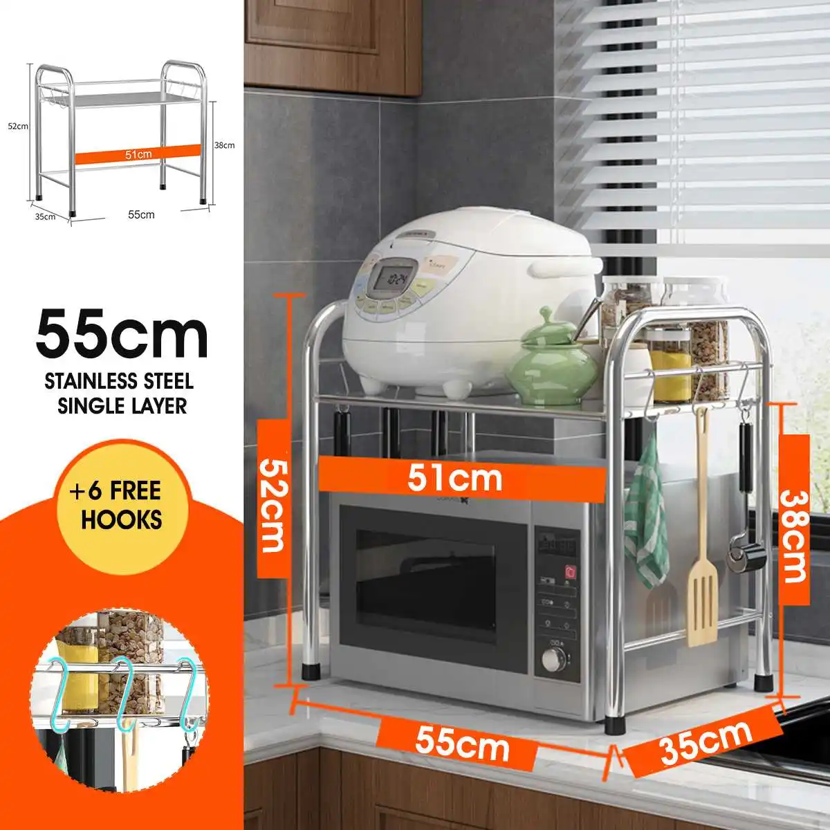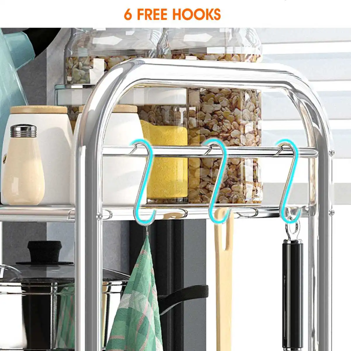 Stainless Steel Single-layer Microwave Oven Rack + Hook Kitchen Storage Holder Multi-use Oven Spice Rack Steel with 6 Hooks