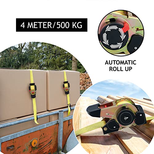 Stakmann Cinghia Fissaggio con Avvolgitore Automatico Fermapacchi, 4m x 3,8 cm, 500Kg Forza di Trazione, Fasce Tiranti con Cricchetto a Pulsante, Fibbie Sicure, Cinghie Ancoraggio, Sgancio Rapido