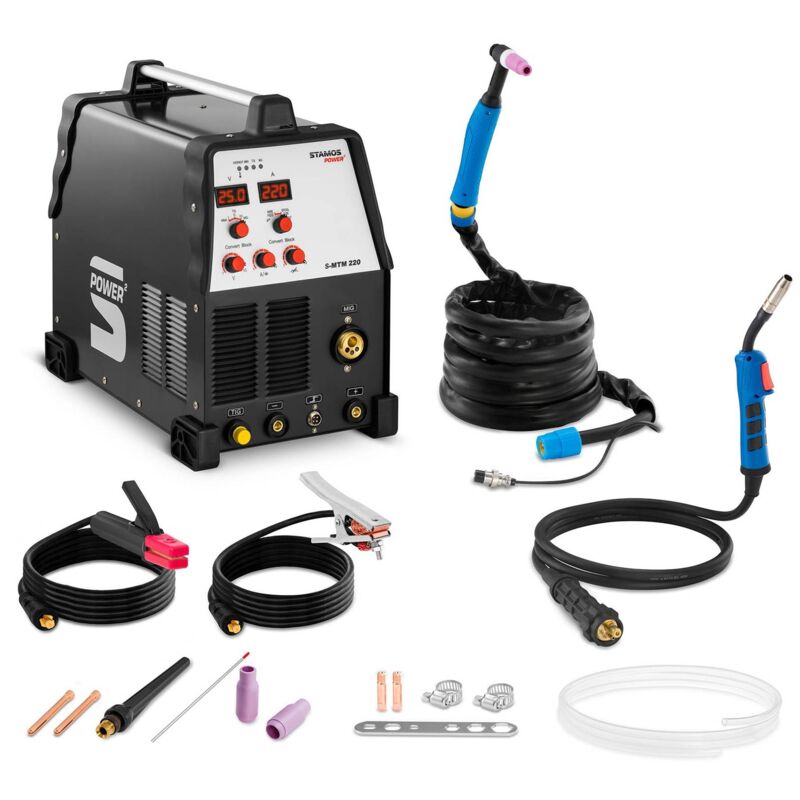 Saldatrice multiprocesso - TIG 220 A - MIG 220 A - E-Hand di marca Stamos Power ² ✅ Modello: S-MTM 220 ✅ Articolo: 10020131 ⬇️ Caratteristiche principali 3 in 1 grazie alla saldatrice combinata per manutenzione e riparazioni Adatta per saldatura MIG/MAG, TIG, CC e a mano Potenza di saldatura 220 Ampere / Allacciamento 230 V Ventole di raffreddamento ad alta potenza per il raffreddamento / Alloggiamento in lamina d'acciaio verniciata a polvere Costruzione compatta e robusta / utilizzabile anche in postazioni mobili grazie alla pratica maniglia ⬇️ Dettagli tecnici Ciclo di servizio [%] 60 Funzioni TIG, MIG/MAG, MMA, FCAW, saldobrasatura Potenza in ingresso [kVA] 5.1 (TIG) / 6.8 (MIG) / 7.8 (MMA) Fattore di potenza 0,73 Potenza in ingresso max. [kVA] 6.6 (TIG) / 8.8 (MOIG) / 10.1 (MMA) Classe di isolamento F Corrente di ingresso massima [A] 30,8 (TIG) / 40,9 (MIG) / 47,2 (MMA) Corrente nominale in entrata [A] 21,7 (TIG) / 31,5 (MIG) / 36,3 (MMA) Classe di protezione IEC IP21 Max.