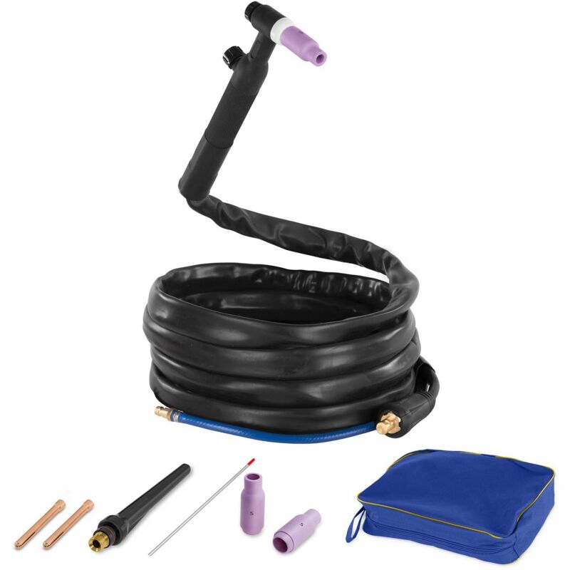 Torcia per saldatura TIG con set tubi flessibili e Lift Arc - 4 m - 9 mm Il set di tubi flessibili per saldatura a torcia della Stamos Germany amplia le saldatrici con funzione Lift Arc rendendole vere e proprie saldatrici TIG. I corrispondenti modelli, come ad esempio il S-MMA 200 LT, sono reperibili nel nostro shop. Questo pacchetto aggiuntivo, con la sua ampia gamma di accessori, rende le saldatrici con attacco da 9 mm ancora più versatili, senza aumentarne il prezzo. Il bruciatore da 3,8 m con tubo di adduzione del gas da 4 m offre un ampio raggio d‘azione per un funzionamento semplice e preciso. Torcia di saldatura TIG di alta qualità con accensione Lift Arc per professionisti L‘accensione Lift Arc supportata dalla torcia, ha una serie di effetti positivi nella saldatura TIG. Anche quando, ad esempio, il pacchetto di tubi flessibili non viene utilizzato a lungo, non si verificheranno inclusioni di tungsteno o problemi di accensione. A differenza, ad esempio, dell'accensione ad