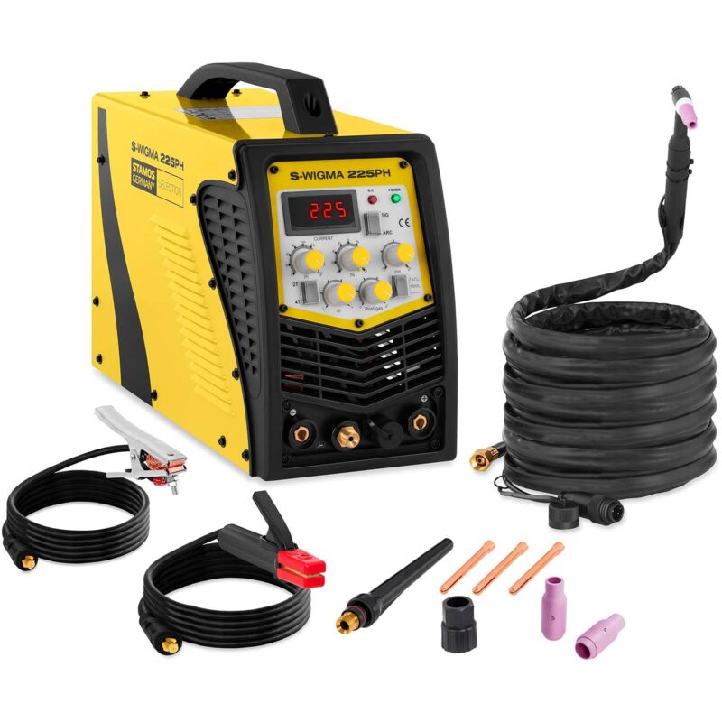Saldatrice TIG DC - MMA - 225 A - 230 V - Frequenze a impulsi - MOSFET - 2/4 tempi Saldatrice TIG S-WIGMA 225PH del marchio Stamos Selection La saldatrice TIG S-WIGMA 225PH del marchio Stamos Selection è caratterizzata dalla massima affidabilità grazie alla sua robusta costruzione e all'impiego delle nozioni più avanzate della tecnica. La saldatrice richiede una tensione di 230 V e pesa solo 13,10 kg per una dimensione di 48 x 37 x 21 cm grazie all'utilizzo di materiali più leggeri, tuttavia stabili. La corrente di saldatura della saldatrice TIG S-WIGMA 225PH è regolabile tra i 10 e i 225 Ampere, il che permette al dispositivo di adattarsi a tutte le condizioni di lavorazione. Compra oggi la saldatrice TIG S-WIGMA 225PH del marchio Stamos Selection!